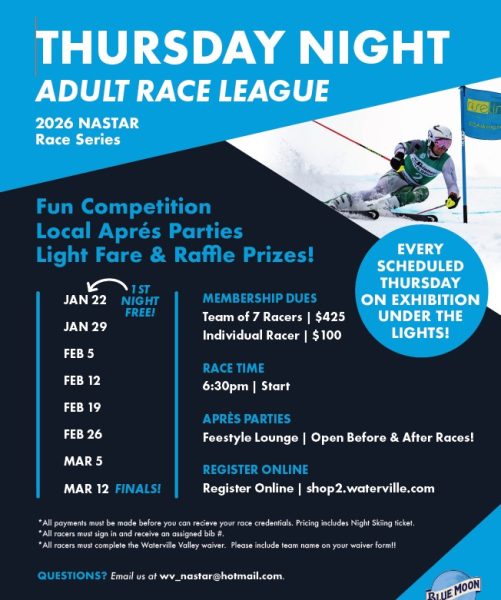 The Thursday Night Adult Race League is back for 2026, bringing high-energy NASTAR racing, fun competition, and unbeatable après vibes to Waterville Valley. Whether you’re a seasoned racer or just looking to challenge yourself in a supportive league environment, this is your night to shine.